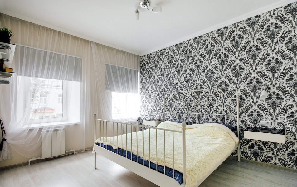 Апартаменты сохраняют архитектурные особенности здания: высокие потолки и камин. Пространство организовано для размещения до четырех человек за счет комбинации двуспальной кровати queen-size и полноценного раскладного дивана. В помещении оборудована обеденная зона, гардероб и предусмотрена система затемнения с двумя типами штор — текстильными и рулонными.