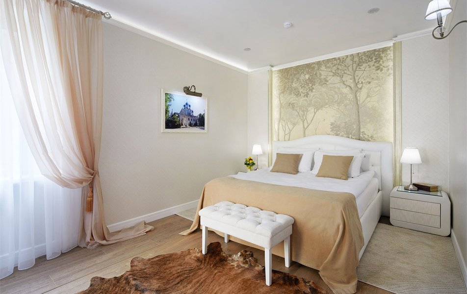 | Мебель | вешалка зеркало кровати односпальные /одна двуспальная кровать прикроватные тумбочки стол стулья шкаф |