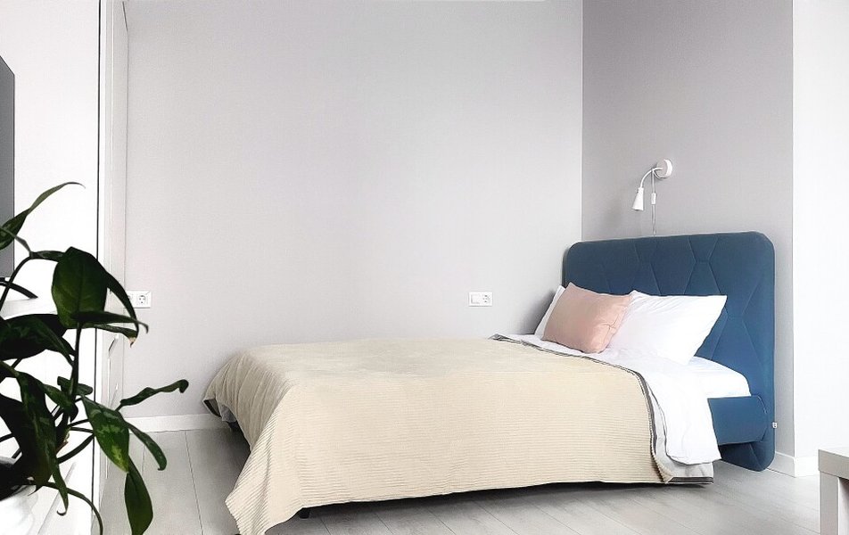 Пространство представляет собой светлую студию в современных мягких тонах, рассчитанную на размещение до четырёх гостей. В дизайне продуманы все функциональные зоны: спальная с комфортной кроватью, гостиная с раскладным диваном, отдельное рабочее место с розетками и вместительный гардероб. Апартаменты отличаются качественной отделкой и вниманием к деталям, создающим атмосферу уюта и практичности.