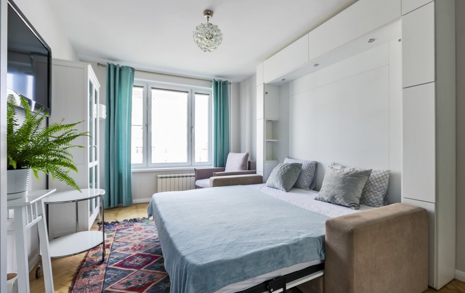 Пространство представляет собой уютную студию площадью 35 кв. м с продуманным интерьером, создающим ощущение «дома для души». Основной акцент сделан на многофункциональность: центральным элементом является кровать-трансформер с ортопедическим матрасом, которая легко превращается в диван, что позволяет адаптировать комнату под разные сценарии отдыха. Дополнительное спальное место обеспечивает раскладное кресло. В апартаментах также предусмотрены светонепроницаемые шторы и дополнительные постельные принадлежности.