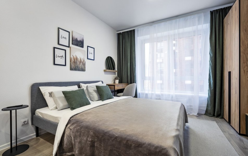 Гостям предлагается современная студия с новым ремонтом, создающая атмосферу свежести и функциональности. Пространство площадью 25 кв. м продумано для комфортного размещения двух человек. Основными зонами являются спальная с удобной двуспальной кроватью, компактная кухня и выделенное рабочее место с компьютерным столом — идеальное решение для деловой поездки или удалённой работы. Практичным дополнением служит вместительный шкаф для вещей.