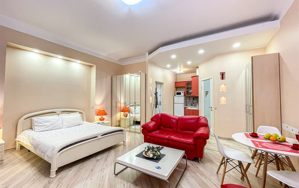 Просторное пространство площадью 42 квадратных метра рассчитано на размещение до пяти гостей. Внутри — удобная двуспальная кровать, двуместный и одноместный диваны. Кухня полностью оборудована. В ванной комнате — душевая кабина, стиральная машина, фен и туалетные принадлежности. Гостей ждут свежее постельное бельё и мягкие полотенца. В апартаментах есть кондиционер, телевизор с плоским экраном, цифровое ТВ, Wi‑Fi, утюг с гладильной доской и система отопления.