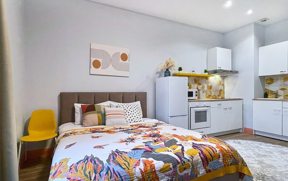 Для комфортного проживания до 4 человек предлагаются уютные апартаменты с дизайнерским ремонтом. В номере есть большая двуспальная кровать, раскладной диван, смарт-телевизор, интернет Wi-Fi, просторный шкаф и прикроватные тумбочки. Совмещённый санузел оснащён вместительной ванной, стиральной машиной, комплектом полотенец и средствами личной гигиены. Кухонная зона полностью укомплектована необходимой техникой: электрическая плита, холодильник, микроволновая печь, электрочайник и набор посуды, а также удобная обеденная зона для самостоятельного приготовления и принятия пищи.