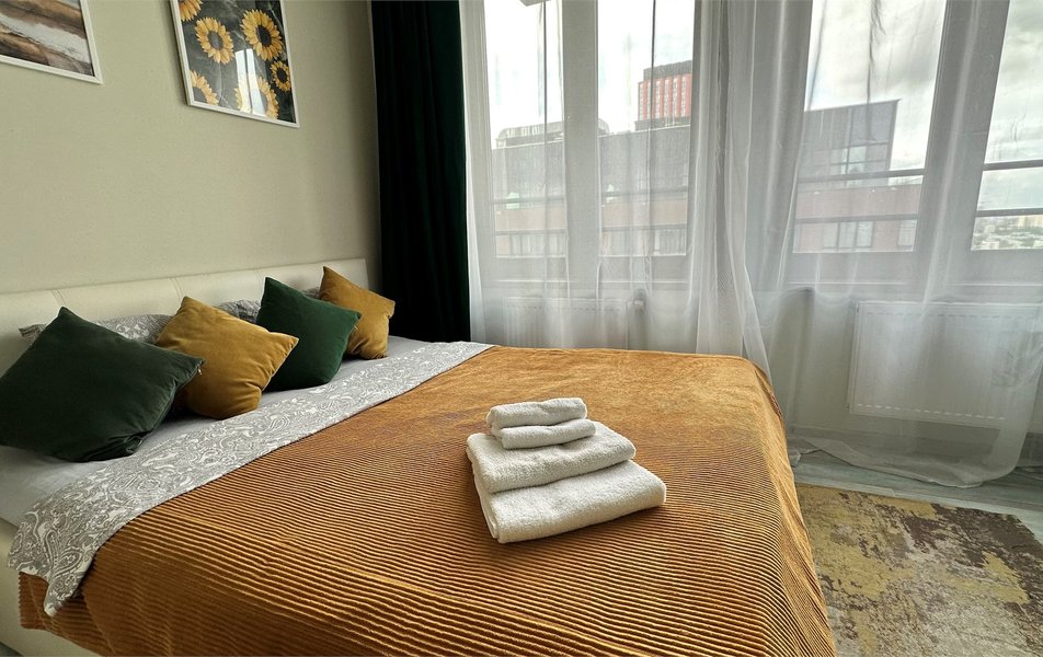 Апартаменты рассчитаны на размещение до 4 гостей, оснащены большой двуспальной кроватью и раскладным диваном. Для комфортного отдыха предусмотрен смарт-телевизор, просторный шкаф для одежды, прикроватные тумбочки и высокоскоростной Wi-Fi. Совмещенный санузел с ванной оснащен стиральной машиной, набором полотенец и средствами личной гигиены.