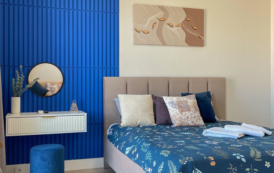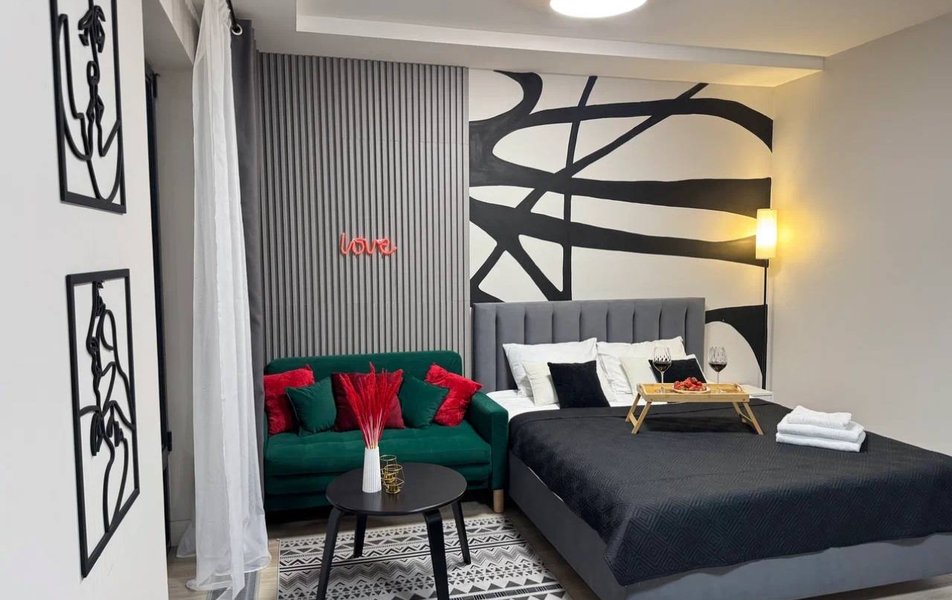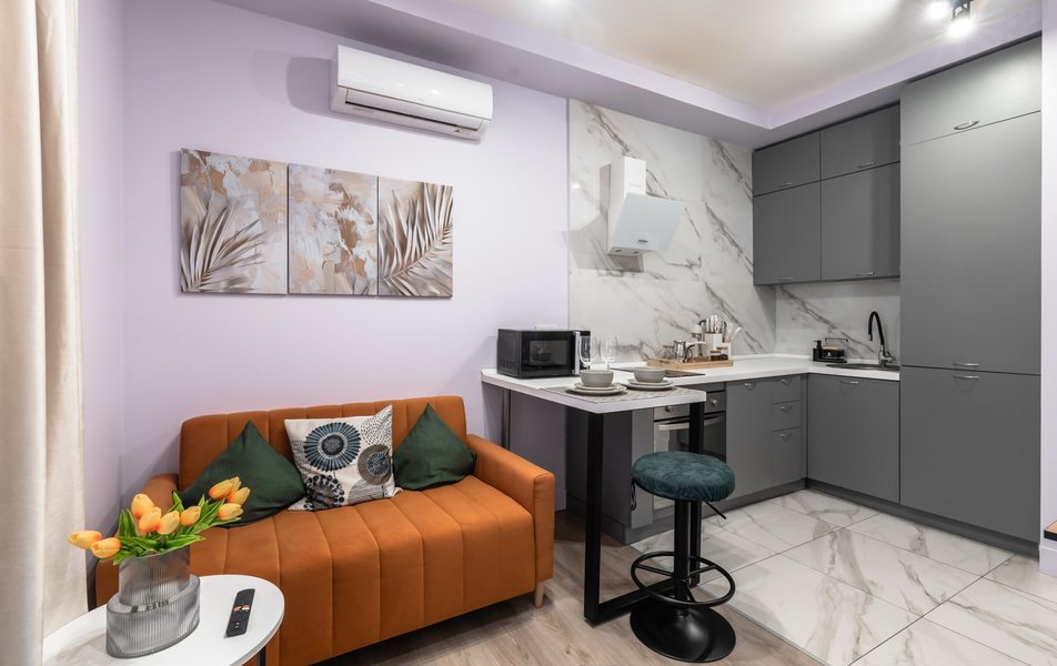 К размещению предлагаются стильные апартаменты с дизайнерским ремонтом и видом на рассветную сторону города. Гости смогут с комфортом разместиться на большой двуспальной кровати и раскладном диване. В номерах предусмотрены гардеробная, ванная комната с душем, кондиционер, Wi-Fi, смарт-телевизор и панорамные окна. Кухня оборудована всем необходимым для самостоятельного приготовления еды: холодильником, микроволновой печью, электрочайником, полноценным набором посуды и удобной обеденной зоной.