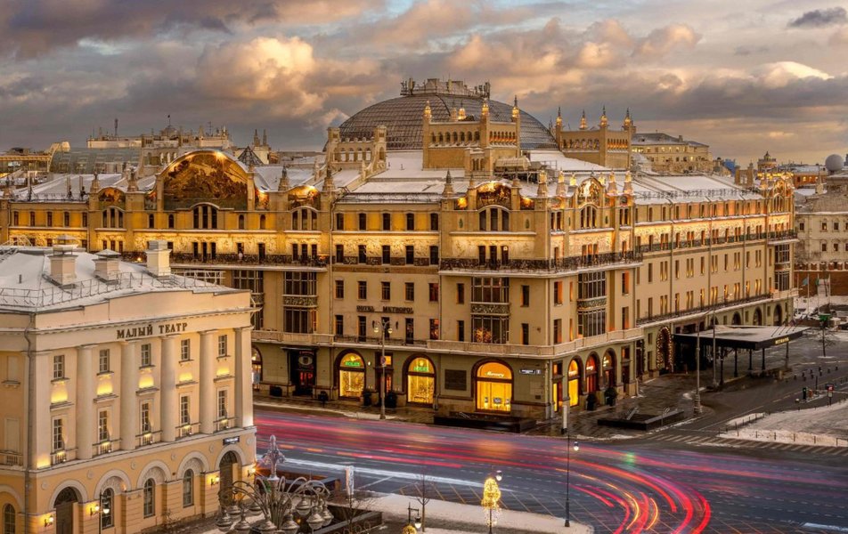 Зал «Метрополь» создан в неоклассическом стиле. Главным его украшением является огромный витражный купол «Сотворение мира», выполненный по рисункам Сергея Чехонина. Зал освещают четыре латунные торшера в виде ваз, а стены украшены изящными бронзовыми светильниками. Архитектор мастерски использовал эффект зеркального отражения: огромные зеркала зрительно расширяют пространство и создают дополнительный источник освещения. Стены главного зала отеля «Метрополь» были свидетелями множества исторических событий стран.| Варианты расположения мест | банкет: 250 фуршет: 300 |