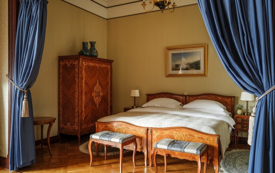 | Мебель | вешалка зеркало кресло кровати односпальные /одна двуспальная кровать прикроватные тумбочки стол стулья шкаф |