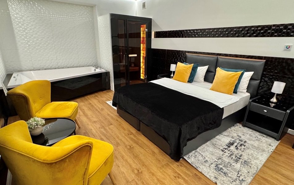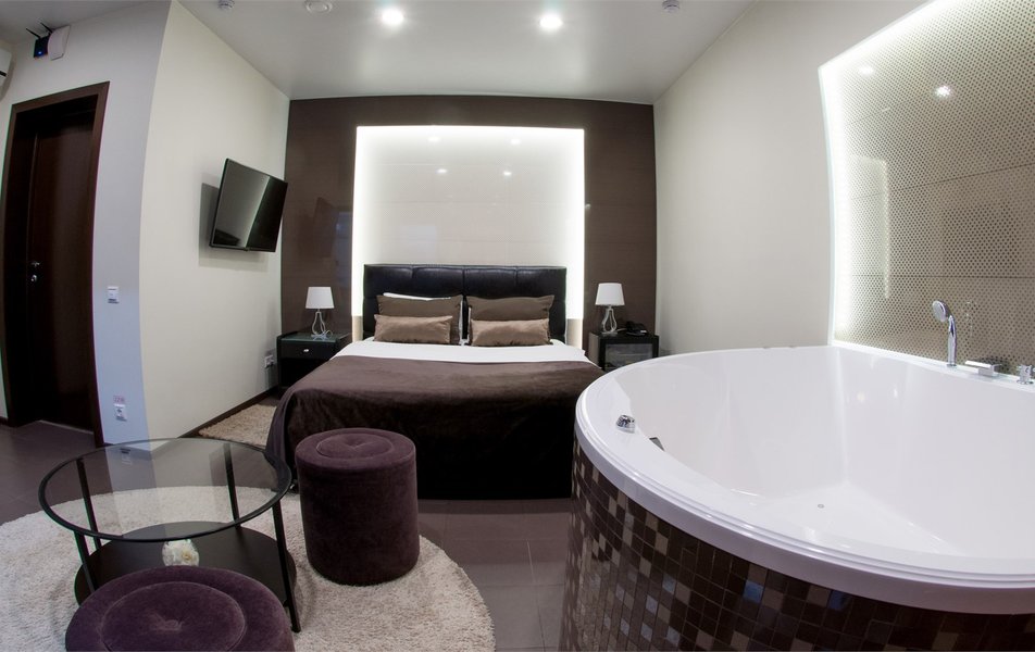 На площади 150 кв.м. размещено несколько зон отдыха, позволяющих гостям отдохнуть, поправить здоровье, провести романтическую встречу в уютной и непринужденной обстановке. К вашим услугам финская и турецкая сауны, бассейн с аэродинамическими лежаками и гидромассажной стенкой, оснащенный современной системой водоочистки и зона отдыха с большой кроватью, столом и мини-кухней.
