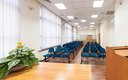 Просторный холл гостиницы заставлен зелеными растениями для лучшего психологического настроения жильцов гостиницы.