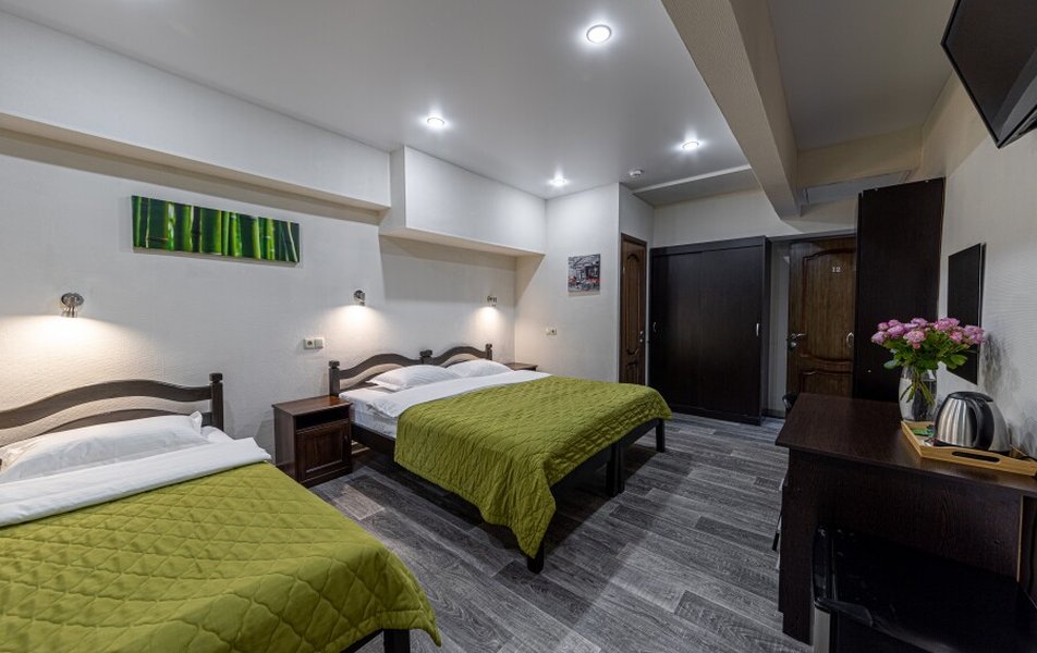 В стенах мини-отеля создано всего 14 тёплых пространств, в каждом из которых обустроен собственный компактный санузел с душевой кабиной. Подбор номеров сделан с пониманием разных потребностей: от простых стандартных комнат для двоих до семейных апартаментов и даже особого трёхместного номера с тремя раздельными кроватями. Вне зависимости от категории, в распоряжении гостей всегда есть рабочий уголок, телевизор и сейф. Более статусные номера порадуют дополнительными бонусами в виде личного холодильника и чайной станции.