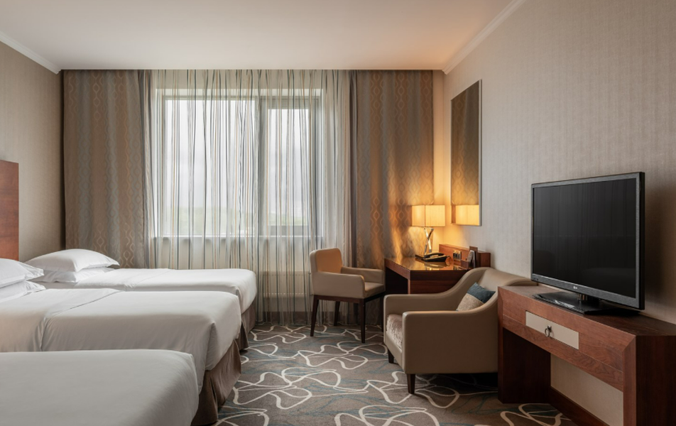 Десятиэтажный корпус отеля разместился на закрытой территории, расположенной на Международном шоссе. В распоряжении гостей просторные одноместные и двухместные номера, а также комнаты улучшенной категории, оснащенные эксклюзивной кроватью повышенной комфортности. Во всех номерах есть индивидуальные санузел с ванной или душем, для отдыхающих подготовлены косметические наборы, халаты, тапочки, в комнатах установлены кондиционер и кофемашина, есть плазменный телевизор, беспроводной интернет.