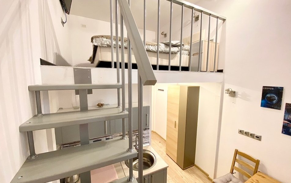 Апартаменты разделены на 2 уровня: жилая зона и удобства расположены на первом уровне, а спальная зона с большой двухместной кроватью 160*200 см. на втором.
