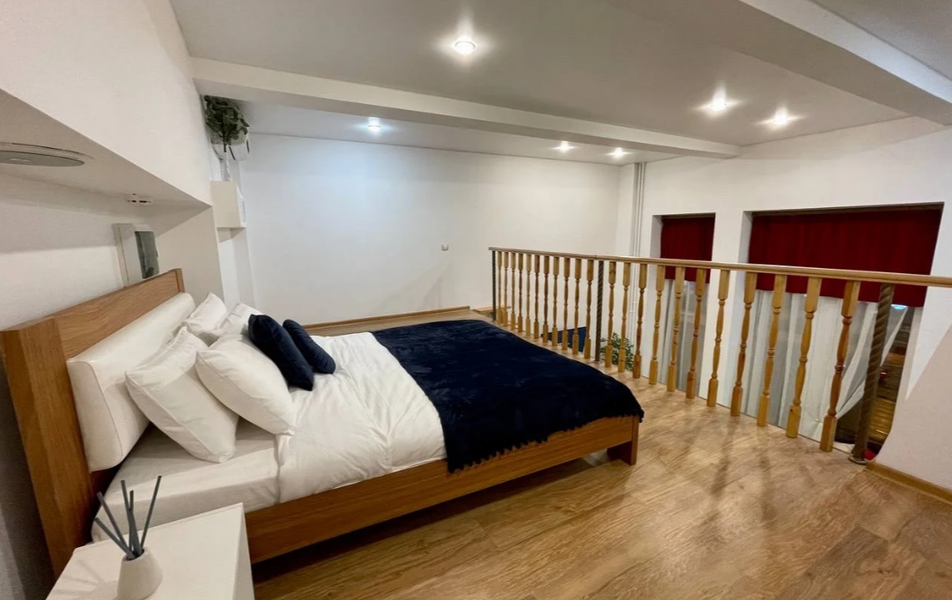 Апартаменты расположились в 6-этажном жилом доме. В комнате выполнен современный ремонт в светлых оттенках. На 2 уровне установлена удобная мебель для отдыха, есть места для хранения одежды. К услугам гостей телевизор с плоским экраном и кабельными каналами, кондиционер, Wi-Fi. Санузел с душевой кабиной, полотенцами, туалетными принадлежностями и феном.