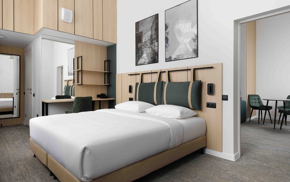 Апартаменты оснащены стильным современным интерьером, включая оборудованную мини-кухню, удобную рабочую зону и достаточное количество мест для хранения вещей. Просторные комнаты позволяют гостям свободно перемещаться и отдыхать после насыщенного рабочего дня. Каждый номер оснащен быстрым Wi-Fi, удобным рабочим местом и мебелью, обеспечивающей комфорт при длительной работе или отдыхе.