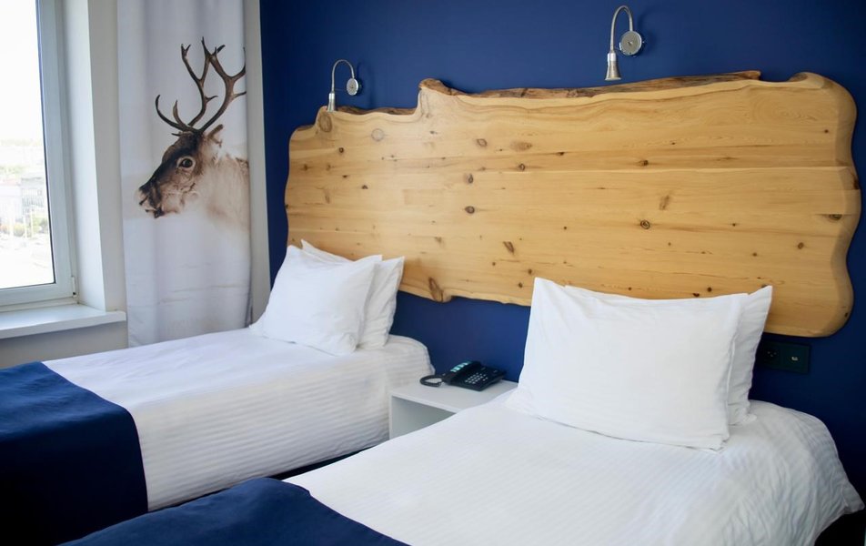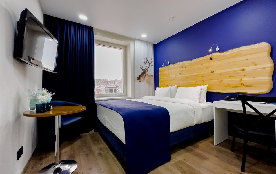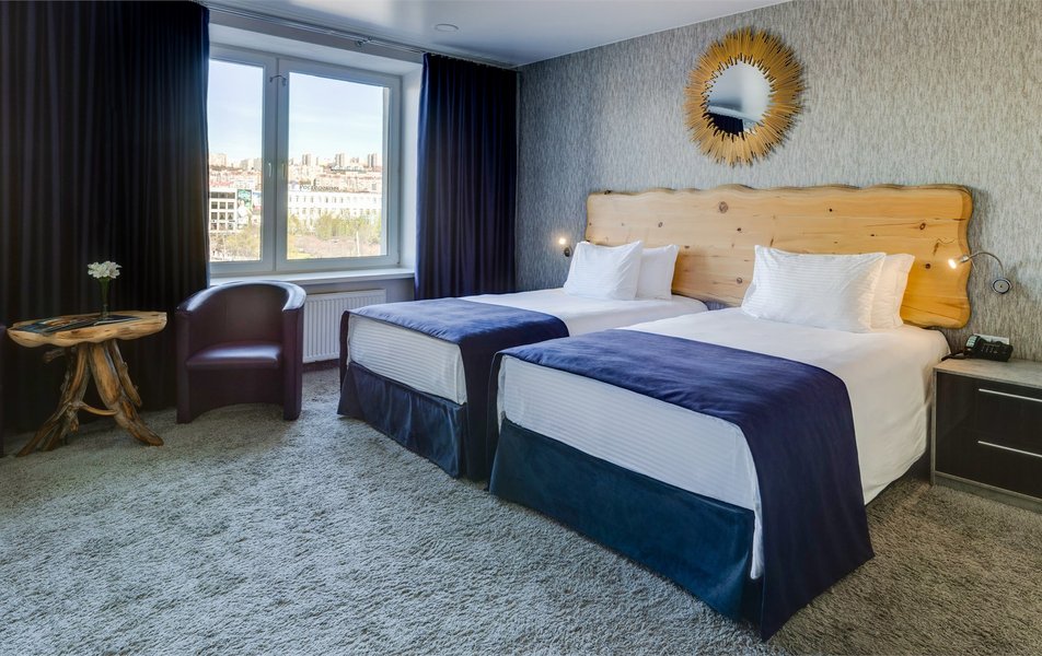 Девятиэтажный корпус отеля, оснащенный лифтом, обращен главным фасадом к центральной площади Пяти углов. Жилой фонд, способный принять более 250 человек, предлагает комфортабельные номера разных категорий. В комнатах интересный современный интерьер, выдержанный в приятных темно-синих оттенках с использованием ярких акцентных тонов. Везде есть просторный санузел с душем, электрочайник, мини-холодильник, плазменный телевизор.