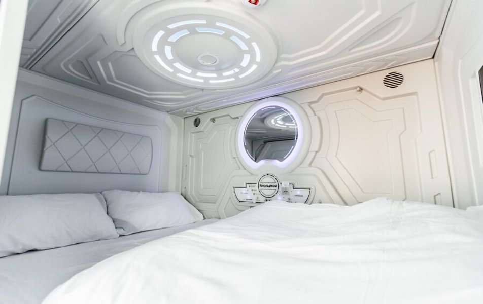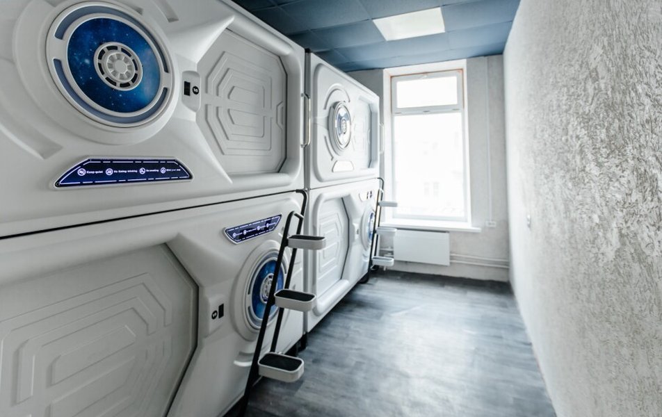 Гости могут выбрать одноместную капсулу для уединённого отдыха или двухместную — для путешествующих парой. Каждая капсула представляет собой приватное пространство с ортопедическим матрасом и звукоизоляцией, что позволяет полноценно отдохнуть после насыщенного дня в городе. Для общих нужд в отеле оборудована просторная кухня, где можно приготовить еду или выпить чай, а также зона отдыха с диванами и столиками.