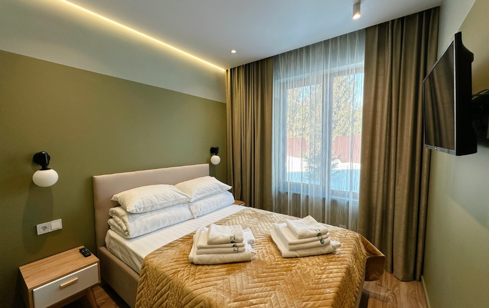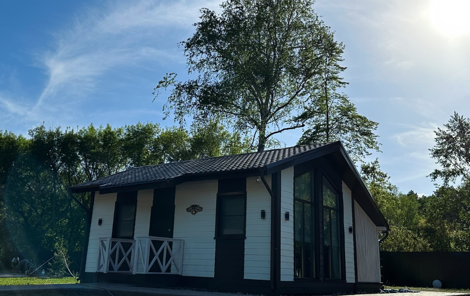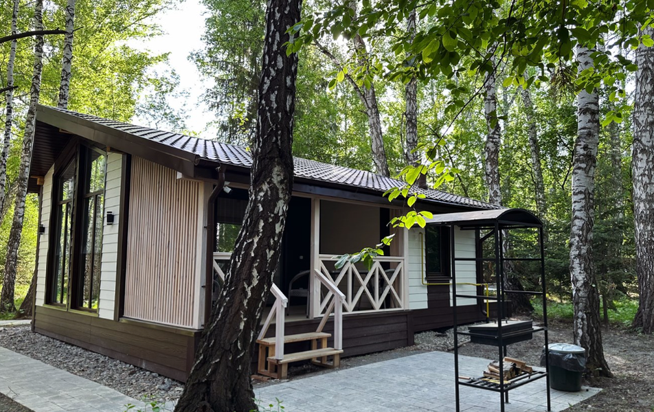 Каждый дом полностью оборудован для комфортного отдыха. Внутри — кухня-гостиная с обеденной зоной и раскладным диваном, просторная спальня, современный санузел с душевой кабиной и большой встроенный шкаф у входа. Техника включает кондиционер, плиту, микроволновую печь, холодильник, тостер и полный набор посуды. В каждой комнате есть телевизор для уютных вечеров. Это место, где продумана каждая деталь, чтобы отдых у леса и реки стал по-настоящему гармоничным.