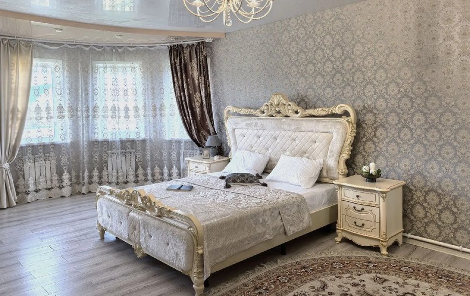 Коттедж разместился на закрытой территории площадью девять соток и представляет собой двухэтажное здание, выполненное в классическом стиле. Дом рассчитан на размещение до 12 гостей и включает пять отдельных комнат с высокими потолками и большими окнами. Обустроена современная кухня, оснащенная бытовой техникой, в том числе духовкой и посудомоечной машиной. Оборудовано два санузла, в одном из которых находится душ. Установлен ЖК-телевизор, есть доступ к беспроводному интернету.