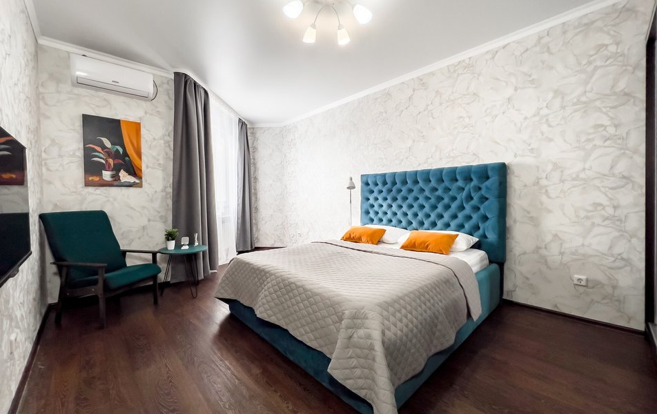 Внутреннее пространство рассчитано на комфортное размещение до четырёх человек. В спальной зоне установлена двуспальная кровать 160/200, в гостиной — раскладной диван 140/200. Работает сплит-система. Кухня оснащена всем необходимым: микроволновая печь, холодильник, посуда на четыре персоны, чай и кофе. В распоряжении гостей также стиральная машина. В ванной комнате предусмотрены средства гигиены (гель для душа, одноразовые зубные щётки), а для каждого гостя подготовлены постельное бельё и полотенца. Имеется беспроводной интернет. После каждого выезда проводится тщательная уборка, гарантируется полное соответствие апартаментов фотографиям.