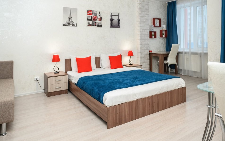 Просторные апартаменты располагаются в 25-этажном жилом комплексе. В комнатах выполнен современный ремонт. Установлена удобная кровать, шкаф для хранения одежды, прикроватные тумбочки. Есть телевизор, стиральная машина, гладильные принадлежности. Санузел с ванной. Для удобства гостей предоставляются туалетные принадлежности и фен.