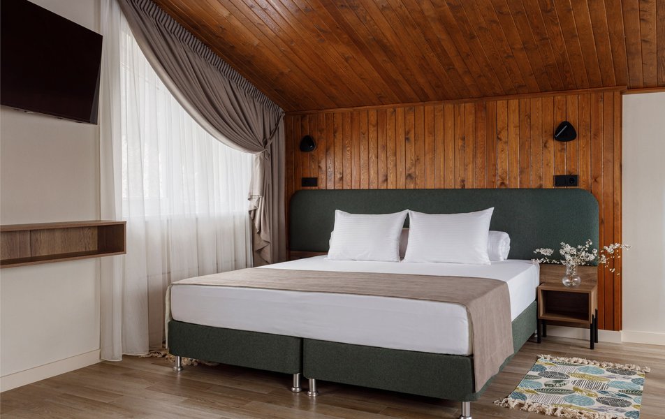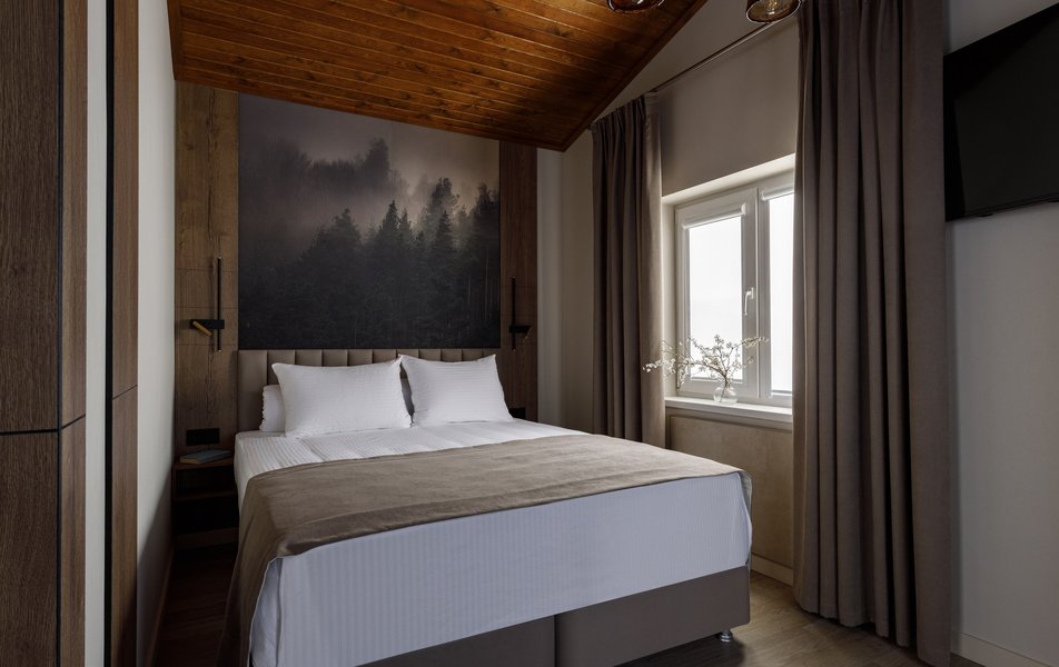 Всего десять отдельных домиков, разбросанных по территории, дарят редкое ощущение простора и личного пространства. Из каждого окна видно горы, и каждый сезон раскрашивает этот вид по-своему, так что пейзаж за стеклом никогда не надоедает. Жить здесь можно вдвоём, втроём или вчетвером — под любой компанию найдётся свой вариант.