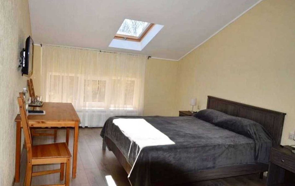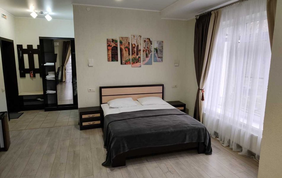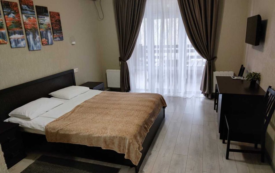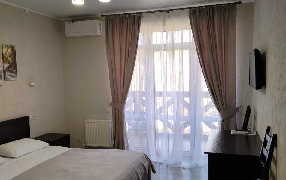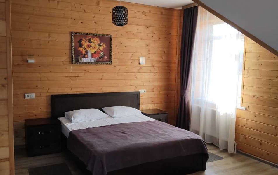 Трехэтажный корпус отеля выстроен в виде классического альпийского шале. В распоряжении гостей 17 номеров разных категорий комфорта. В каждом предусмотрены индивидуальные удобства, есть сплит-система, электрочайник, телевизор, в большинстве комнат предусмотрены меблированные балконы или террасы с видом на горы.