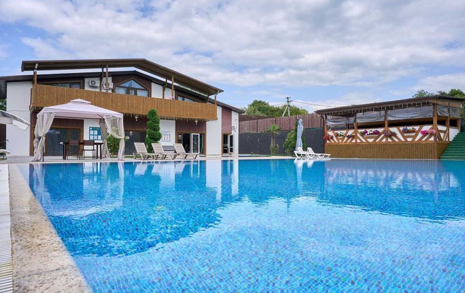 На территории комплекса расположен большой круглогодичный бассейн с подогревом, где можно наслаждаться плаванием в любое время года. Рядом находится роскошное джакузи — идеальное место для релаксации после насыщенного дня. Для комфортного отдыха предусмотрены шезлонги и зона для загара.