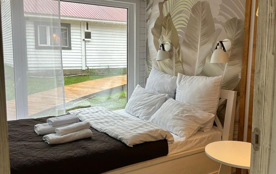На благоустроенной территории, расположенной в живописной местности всего в 350 метрах от берега реки, разместились одноэтажные деревянные корпуса. Всего в распоряжении гостей 30 комфортабельных уютных номеров, в каждом имеется индивидуальный кухонная зона, холодильник, электрочайник, плазменный телевизор, санузел с душем.