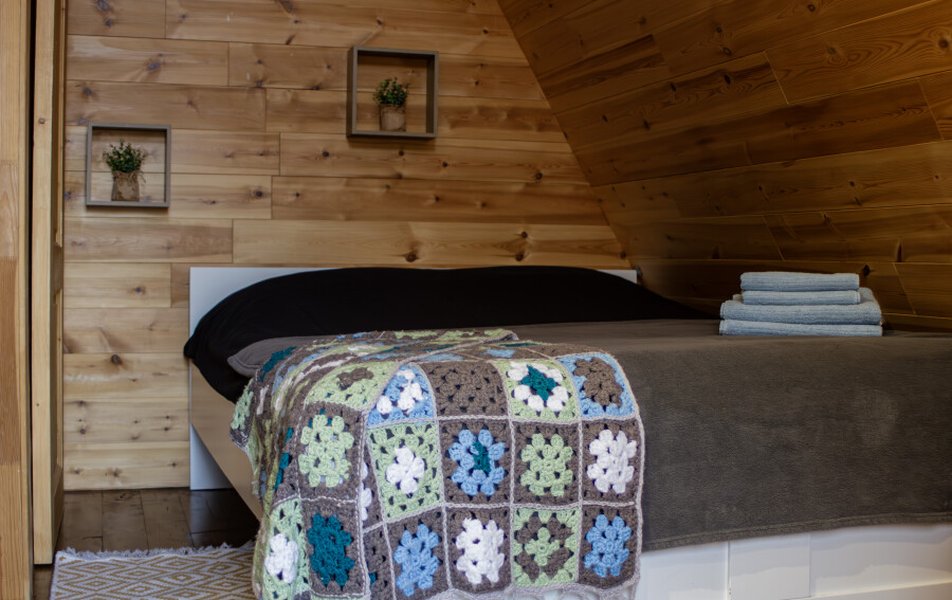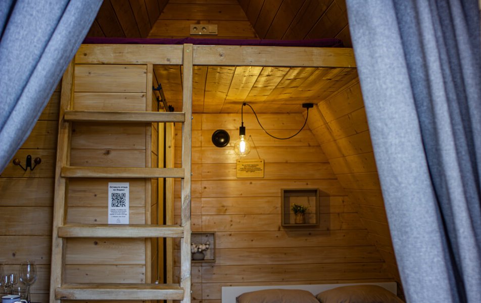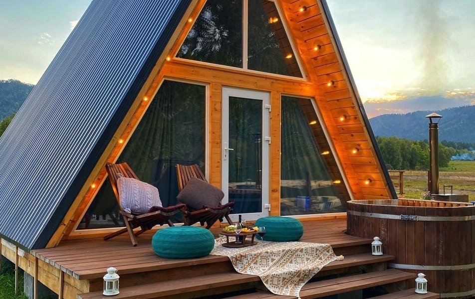 База отдыха занимает компактную уютную территорию, на которой разместилось три дома в стиле а-фрейм. Домики оборудованы всем необходимым для комфортного проживания. В распоряжении гостей удобные спальные места, кухня с плитой и посудой для самостоятельного приготовления, персональный санузел с душем и туалетными принадлежностями. В домах нет ни экрана телевизора, ни беспроводного интернета, что позволяет забыть о повседневных заботах и погрузиться в атмосферу отдыха на природе. А насладиться кинопоказом можно в летнем кинотеатре под открытым небом.