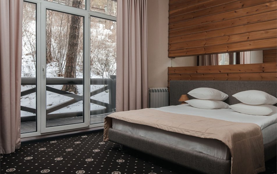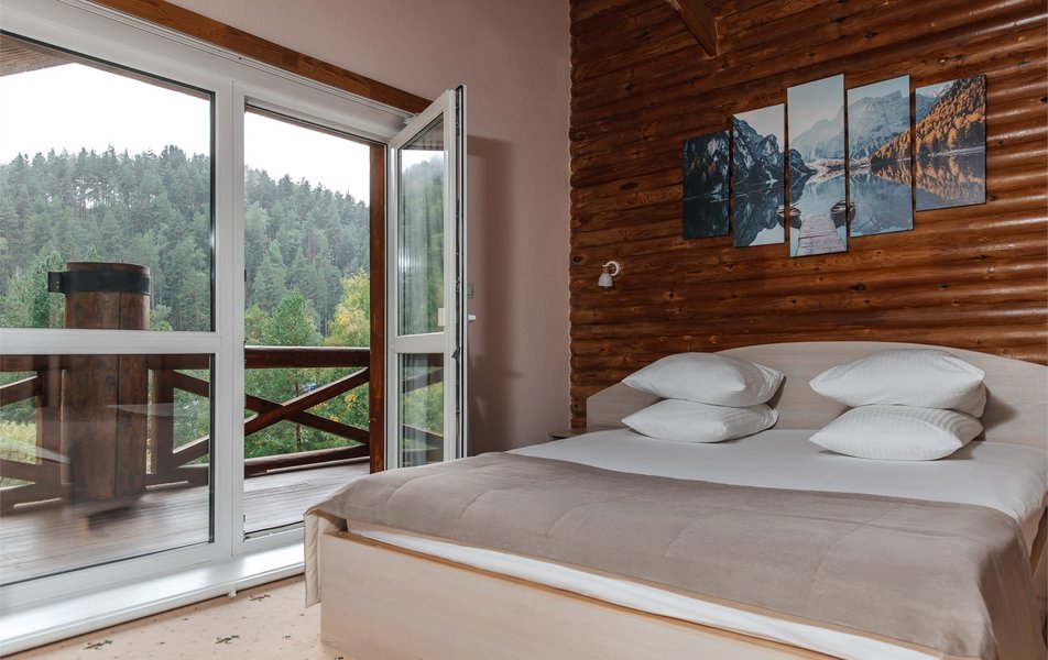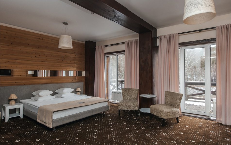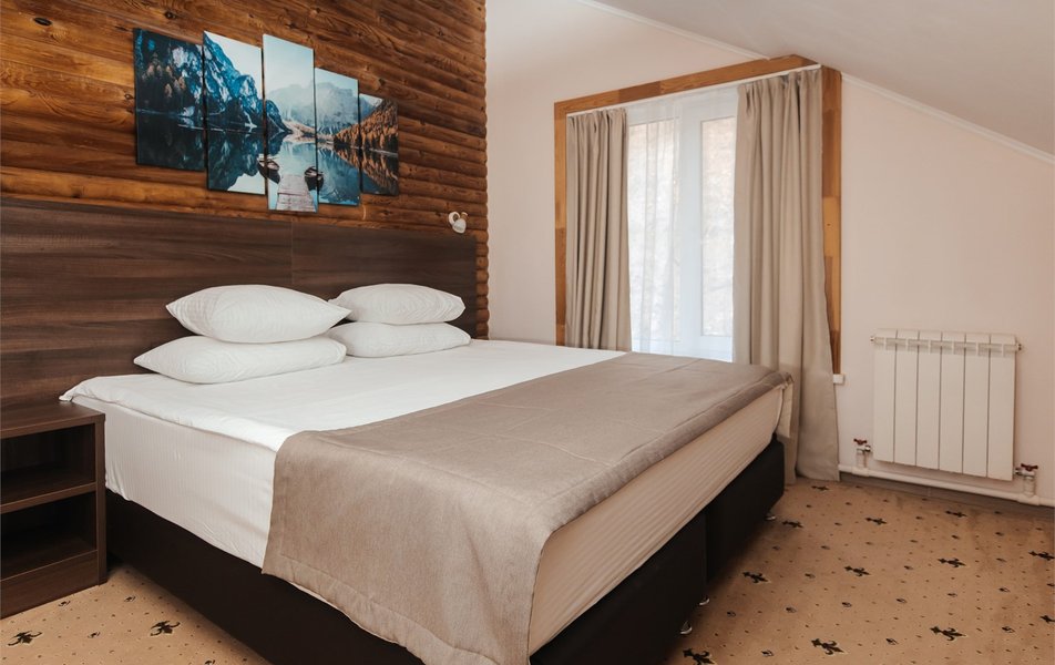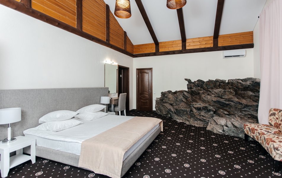 Для размещения предусмотрены четыре жилых корпуса. Первые два – 4-этажные близнецы «Ступени», соединенные с 3-этажным корпусом «Правительственный» зданием, в котором расположен ресторан и медицинский центр. Последний корпус – 2-этажный «Президентский» - связан с остальными корпусами переходом. Номерной фонд эко-курорта рассчитан на небольшое количество гостей. В каждом номере: душевая кабина, холодильник, спутниковое телевидение, wi-fi, туалетные принадлежности, фен, минеральная вода из собственной скважины.