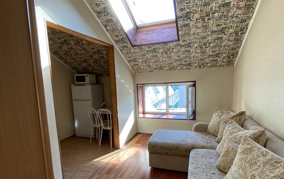Апартаменты находятся в жилом 6-этажном доме, не оснащенном лифтом. Для размещения предлагается небольшая, но уютная студия на шестом этаже. В распоряжении гостей удобный раскладной диван, зонированная кухонная зона с обеденной группой, плитой и прочей кухонной утварью, чтобы можно было готовить самостоятельно. В совмещенном санузле – полноразмерная ванна, предметы гигиены, фен. Для гостей приготовлены комплекты полотенец, свежее постельное белье. Для повседневного ухода за одеждой имеется стиральная машина и гладильные принадлежности. Чтобы гости всегда могли оставаться на связи, предусмотрен доступ к беспроводному интернету wi-fi.