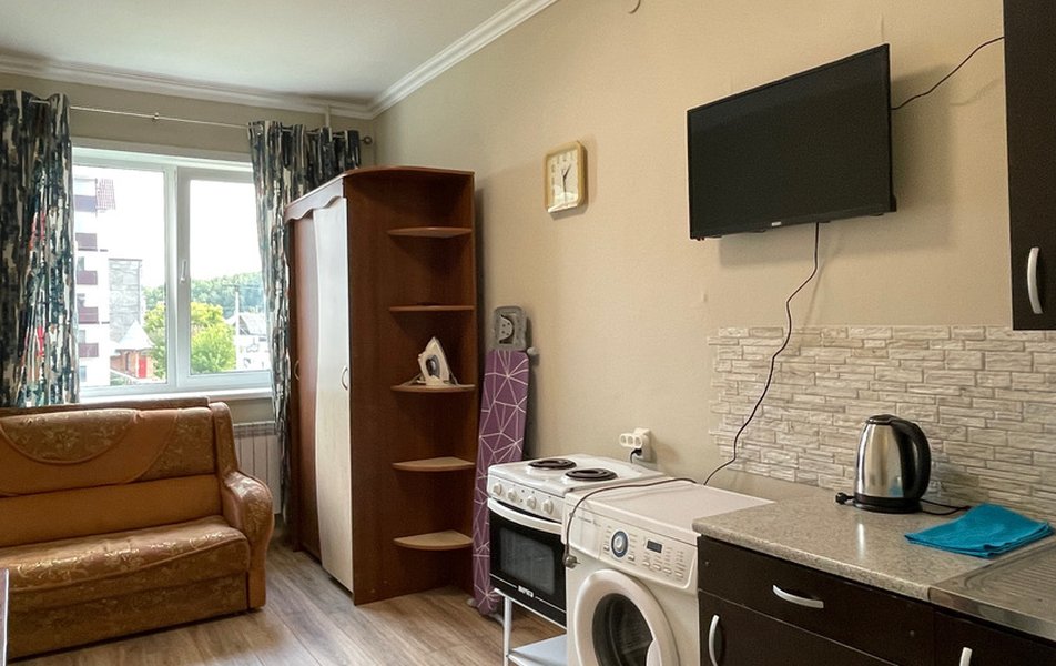 | Оборудование | гладильная доска микроволновая печь набор посуды плита электрическая стиральная машина телевизор утюг холодильник электрочайник |