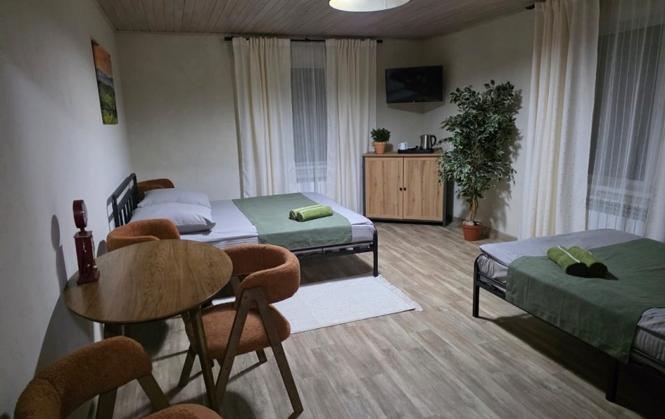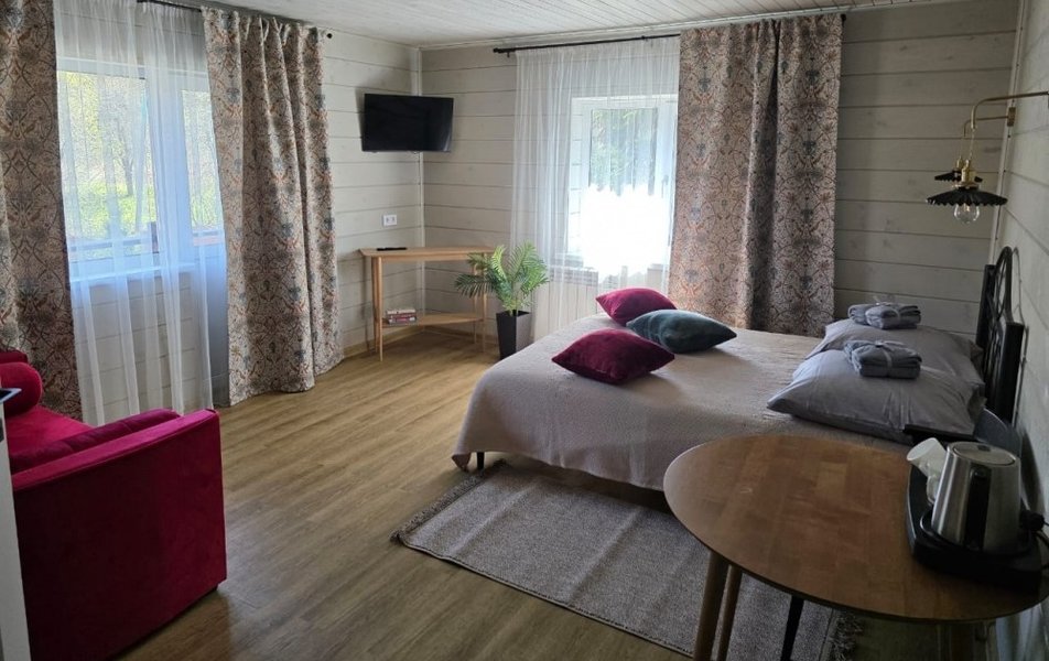 На закрытой благоустроенной территории разместились теплый трехэтажный гостевой дом, двухэтажный летний и небольшой одноэтажный домик, рассчитанный на 4 гостей. Всего в гостевом доме 12 номеров с уютными светлыми интерьерами. В каждом номере есть вся необходимая мебель и плазменный телевизор. Душевые — общие, расположены на этаже или на территории. Комнаты на втором этаже гостевого дома полностью благоустроены, и предусматривают санузел и душ прямо в номере. Номера категории сьют являются двухэтажными, укомплектованы полным комплектом мебели и техники, включая мни-екхню, а также персональным санузлом с душем.