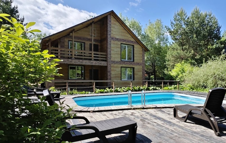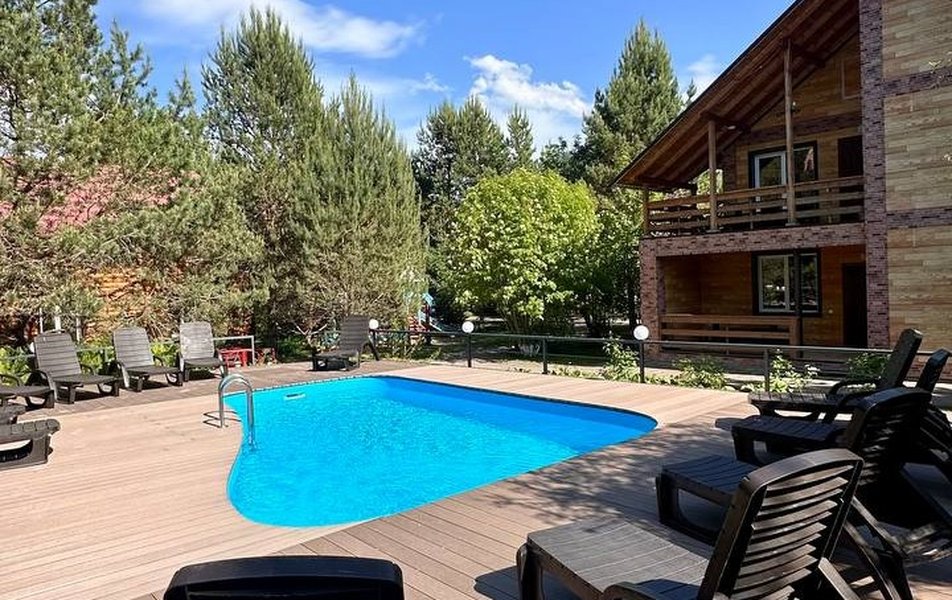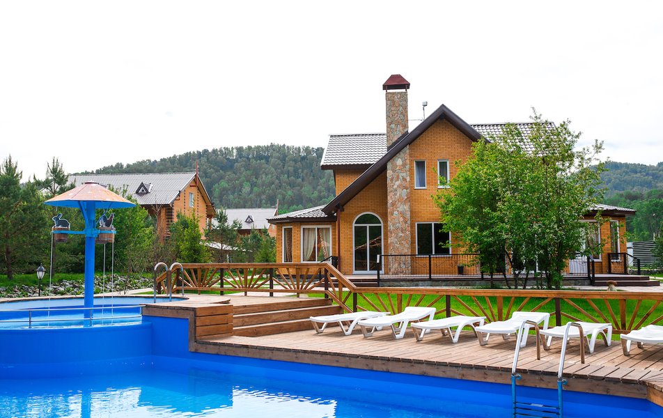 Индивидуальная территория с выходом на берег Катуни, второй открытый бассейн без подогрева с пляжной зоной. На первом этаже расположен собственный бассейн