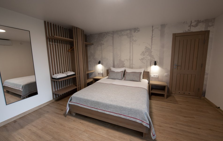 Комплекс работает круглогодично. С просторной территории открываются живописные горные пейзажи. Гостей встречает продуманный ландшафт: аккуратные жилые корпуса в эко-стиле, ухоженные зеленые газоны, мощенные камнем дорожки, фонтан, зоны для отдыха и беседки для пикника. Жилой фонд условно разделен на секторы и представлен разноплановыми корпусами. Для размещения предлагается 90 единиц размещения: уютные номера, просторные шале, коттеджи и аутентичные кедровые домики. Все они построены из экологически чистых материалов и дарят настоящее единение с природой. Изюминкой среди корпусов является VIP-коттедж «Лесной барин» на три номера с собственной территорией, выходом в лесопарк и берег реки, открытым бассейном с детской чашей, баней, игровым павильоном и беседкой для пикника. Отделка номеров выполнена материалами из древесины. Гостей ждет удобная оригинальная мебель, индивидуальные WC с душевыми кабинами или ваннами, ТВ, холодильники.