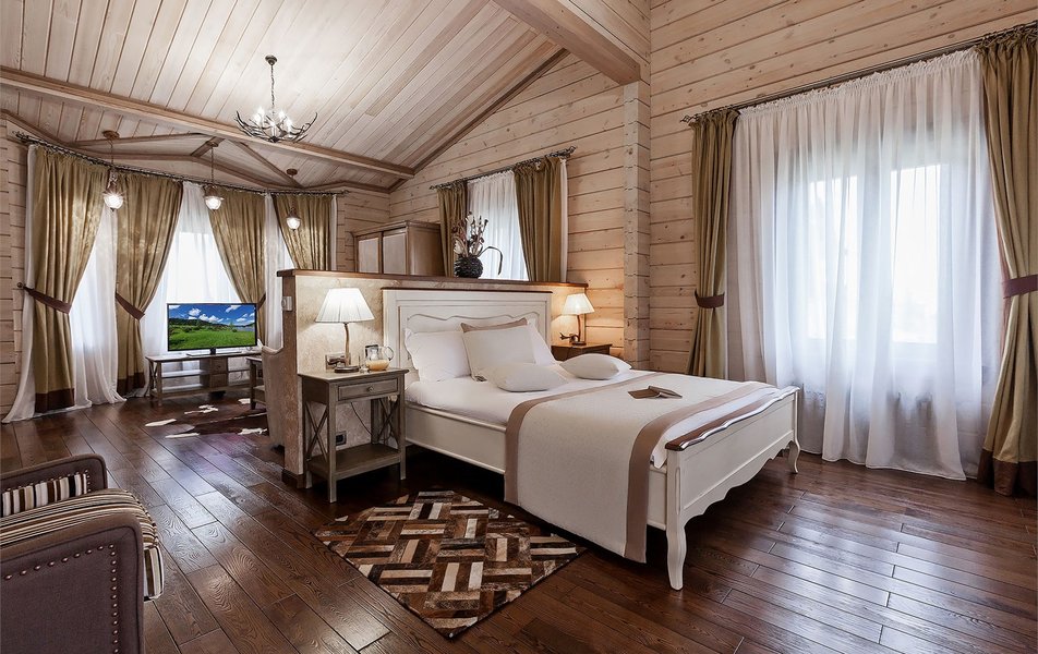 Для проживания представлены коттеджи из массива кедра в русском стиле, дома из клееного бруса сосны в стиле швейцарских шале, а также новая 3-этажная гостиница «Эдельвейс» в центральной части территории комплекса. Все корпуса обладают современными интерьерами и выполнены из эко-материалов. В каждом номере царит королевский комфорт и уют. Номера в гостинице дополнительно оборудованы кроватями-трансформерами, а часть номеров адаптирована для маломобильных гостей.
