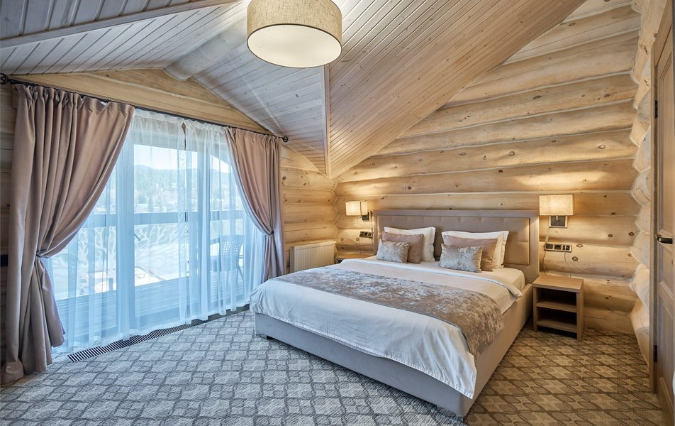 Трехэтажный корпус отель, выстроенный из кедра в стиле альпийских шале, находится прямо на берегу озера. В распоряжении гостей комфортабельные номера с удобствами. В комнатах – необходимая мебель и бытовая техника: телевизор, мини-холодильник, чайная станция, в индивидуальном санузле установлена душевая кабина, а для отдыхающих подготовлены халаты, туалетные принадлежности, фен. Все номера оборудованы балконами, с которых открываются красивые виды на живописную природу.