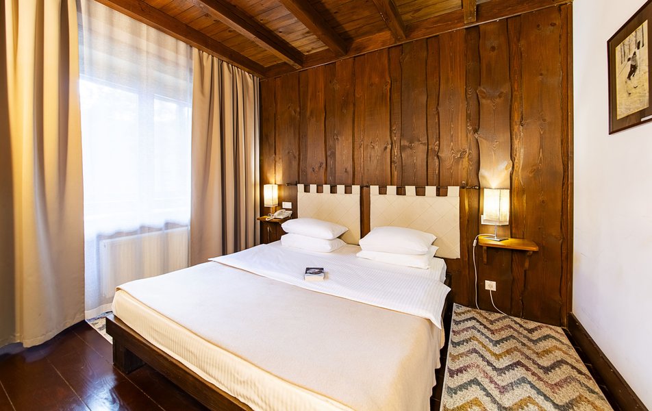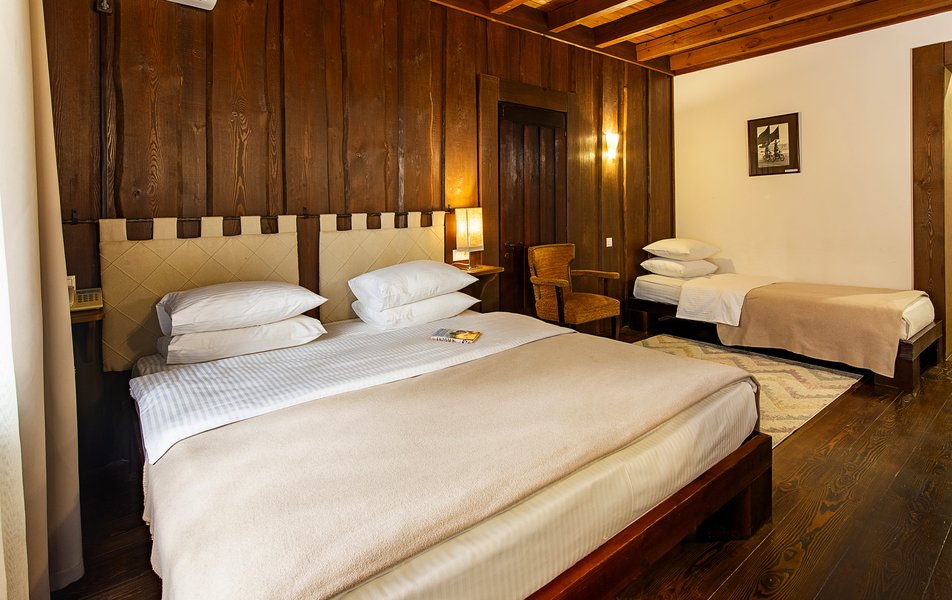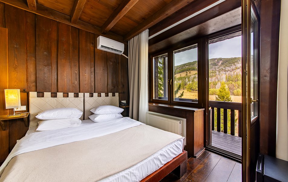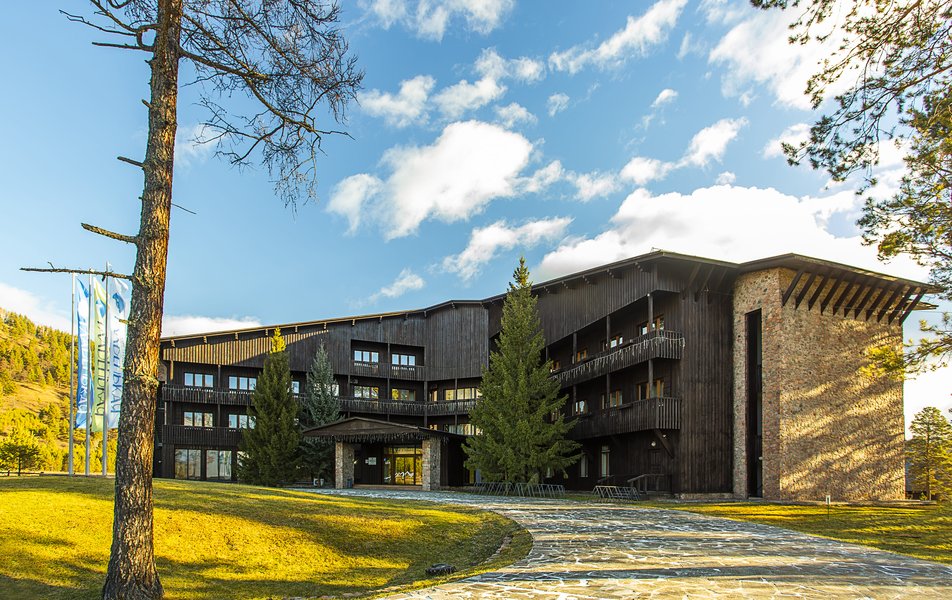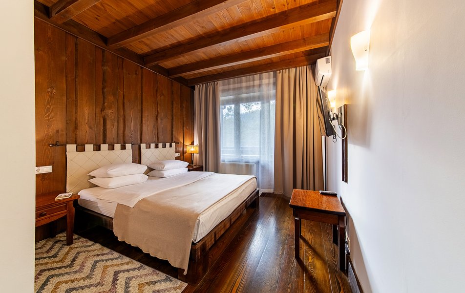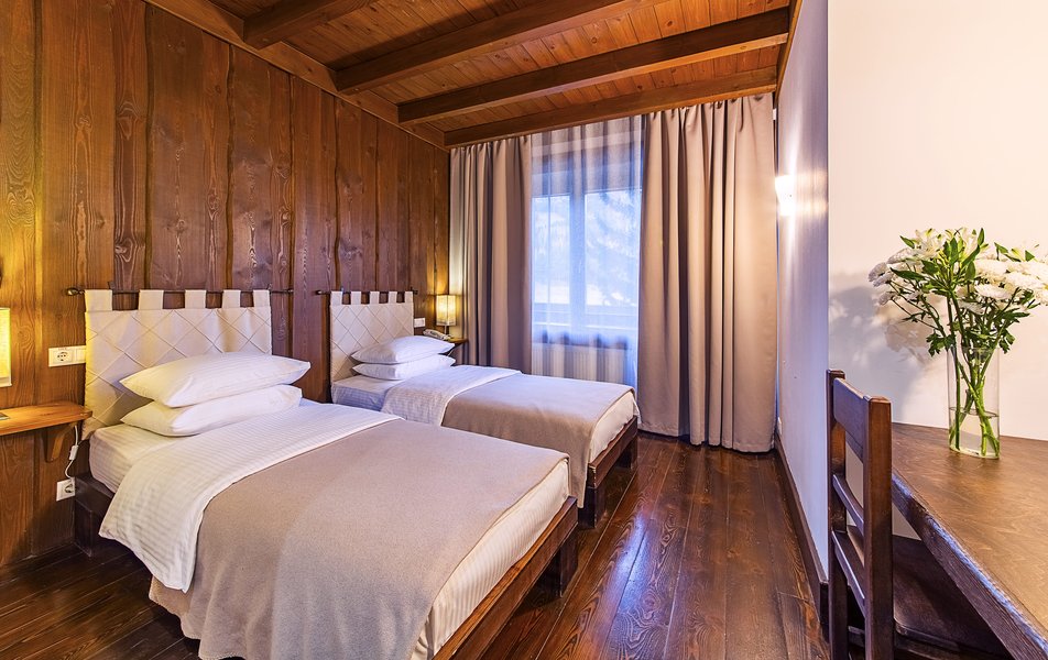 Четырехэтажное здание в форме трилистника выстроено по типу деревяных шале. Эко-концепция корпуса прослеживается и во внутреннем убранстве, отделка выполнена из природных материалов: натурального камня и дерева. В распоряжении гостей 68 номеров различной категории, в общей сложности рассчитанные на 125 отдыхающих. Во всех номерах есть балкон, собственный санузел с ванной или душем, телевизор, мини-холодильник, фен, а из окон открывается вид на красивый лес.