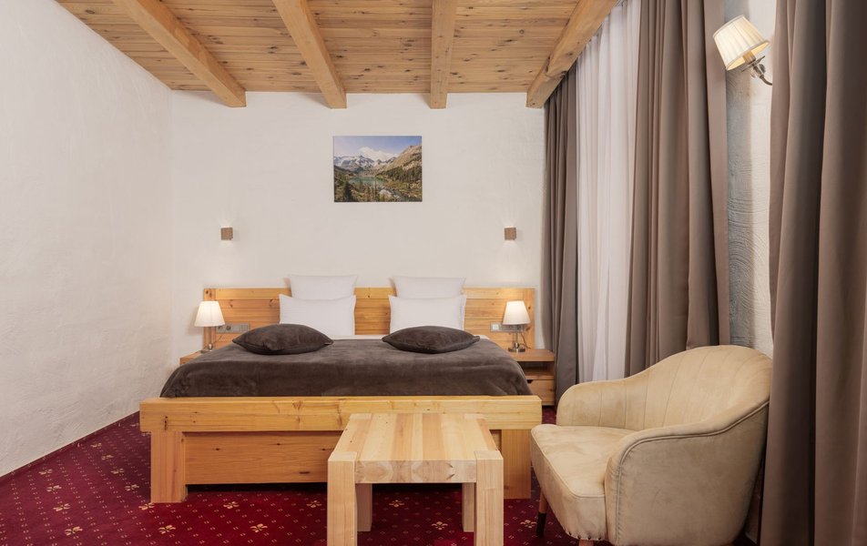 Однокомнатный номер с двуспальной кроватью подходит для размещения двух гостей. Интерьер номера выполнен из натуральных материалов в альпийском стиле. Деревянные окна в пол и красивый вид из номера создают атмосферу уюта.