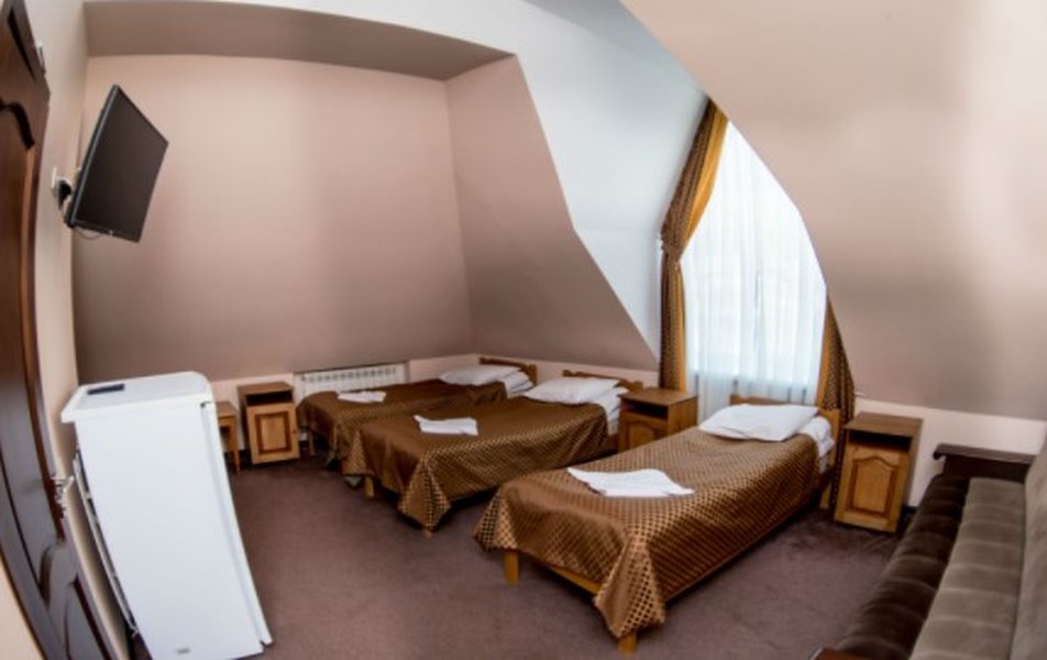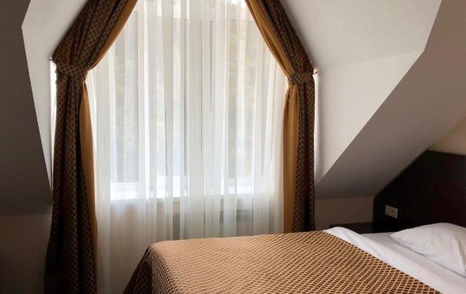 Номер расположен на 4 этаже. Этаж мансардный, балконы в номерах отсутствуют, потолки скошены.