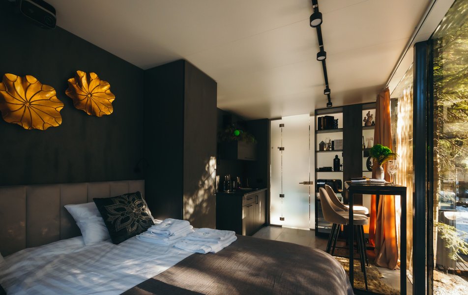 Продуманный до мелочей интерьер каждого шале позволяет почувствовать себя частью этого ландшафта, не жертвуя современными удобствами. Панорамное остекление стирает границу между уютным пространством и внешним миром, открывая виды на хвойный лес и звездное небо. Здесь можно наблюдать, как солнечный свет пробивается сквозь кроны деревьев утром и как зажигаются звезды в одной из самых чистых астрономических точек страны ночью.