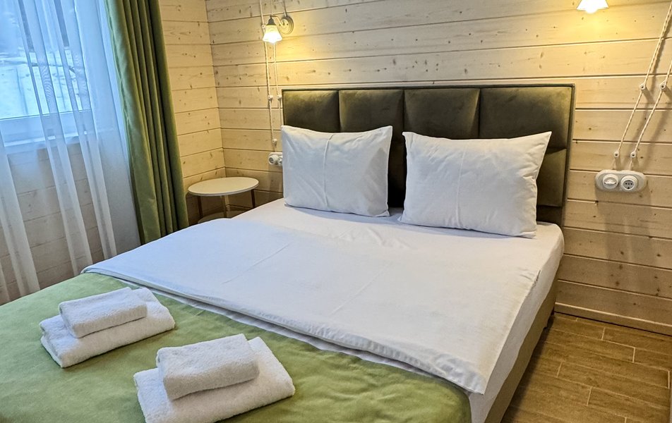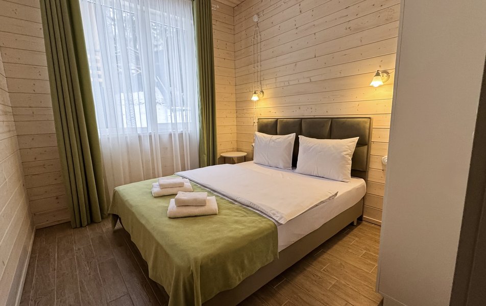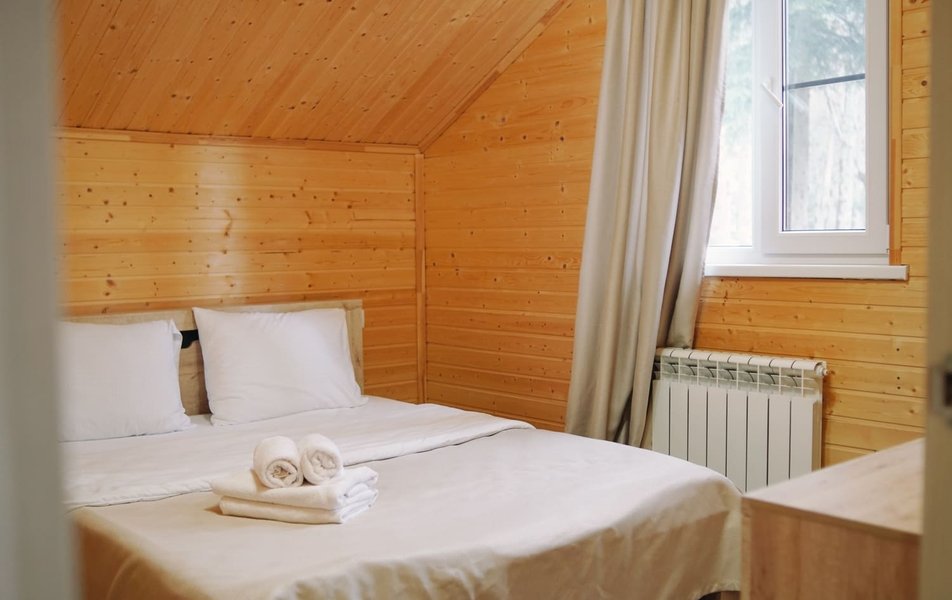 На территории предлагают размещение в деревянных коттеджах разных размеров, рассчитанных на компании до 12 человек в каждом. Внутреннее пространство оформлено в стиле эко‑лофт: натуральная древесина, панорамные окна, тёплый пол и мягкая мебель. В домиках есть кухня‑гостиная с плитой, холодильником, микроволновкой и стиральной машиной, двуспальные кровати, диваны и ванная комната с душем и феном. Многие коттеджи оборудованы собственными террасами с мангалом.