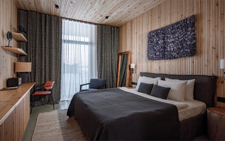 Продуманная архитектура подарила отелю 30 видовых номеров и 4 отдельных гостевых дома. В основе каждого помещения — ручная работа и натуральные материалы: кровати собраны из необработанных брёвен, стены отделаны фактурным северным деревом, а изюминкой интерьеров стали камины из шунгита — камня, добываемого исключительно в этих краях. В номерах предусмотрено всё для автономного комфорта: сплит-система, телевизор, современный санузел с душевой кабиной, фен и набор полотенец. Гостей ждут приятные мелочи: чайно-кофейный набор и бутилированная вода. Отдельные гостевые дома, помимо спален, оснащены мини-кухней, что позволяет готовить простые блюда, не покидая личного пространства. Повсюду работает беспроводной интернет, а дровяные камины создают особую атмосферу тепла даже в самый ненастный вечер.