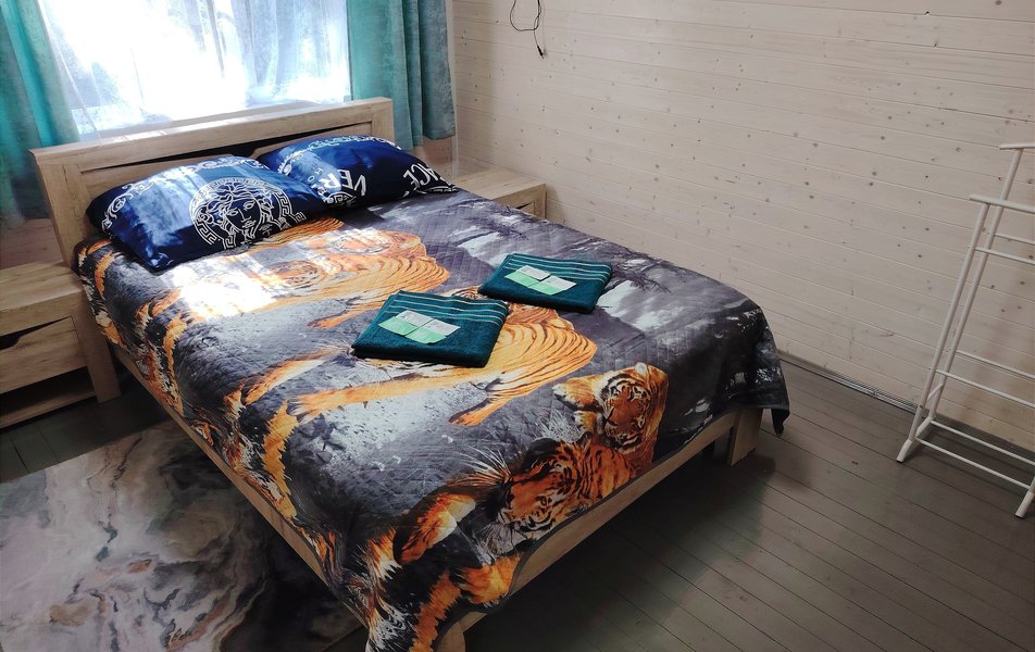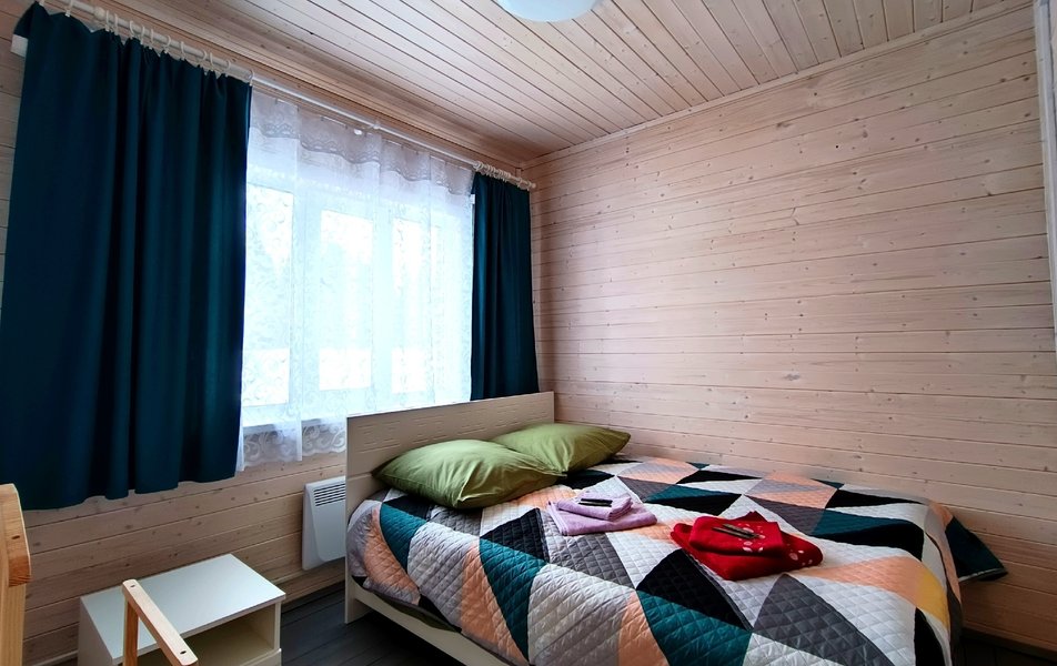 Сам гостевой дом — это новый, современный и очень уютный коттедж, выполненный из дерева в светлых натуральных тонах. Внутри гостей ждет продуманное до мелочей пространство: отдельные спальни с удобными двуспальными кроватями и просторная кухня-гостиная с большим обеденным столом и мягким угловым диваном.