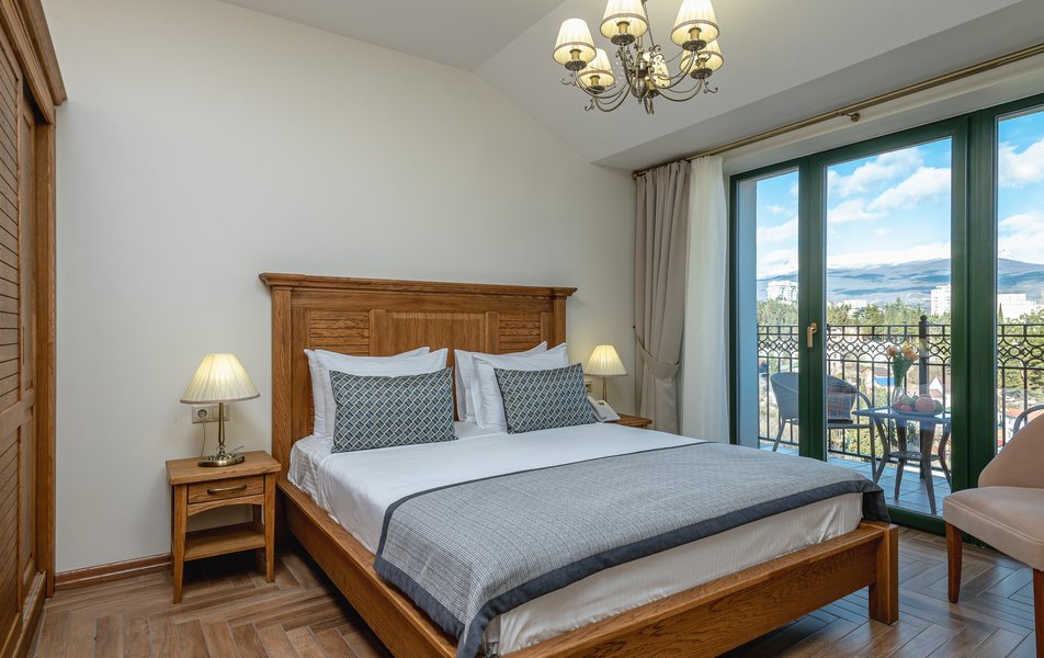 Шестиэтажный корпус отеля занимает небольшую закрытую территорию вблизи набережной Алушты. Каждый номер выполнен в средиземноморском стиле с элементами натурального дерева, в них есть все необходимое для отдыха: кровать с эргономичным матрасом, мини-холодильник, ЖК-телевизор, фен, сейф. В индивидуальной ванной комнате для гостей подготовлены косметические наборы. Из окон некоторых номеров открываются живописные виды на горную гряду Алушты, гору Демерджи и море.
