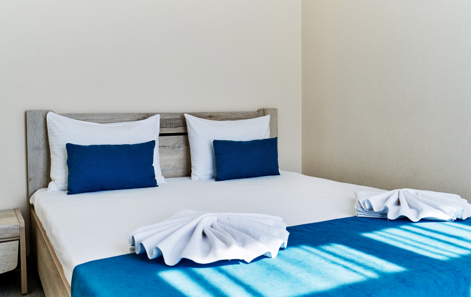 Трехэтажный корпус отеля (без лифта) занимает благоустроенную закрытую территорию. Гостей ожидают уютные однокомнатные номера, просторные двухкомнатные и есть семейные номера с кухней. В общей сложности жилой фонд способен разместить 120 человек. Интерьеры современных номеров выдержаны в светлой гамме с добавлением ярких бирюзовых оттенков. В каждом номере есть собственный санузел с набором косметических принадлежностей, кондиционер и бытовая техника.