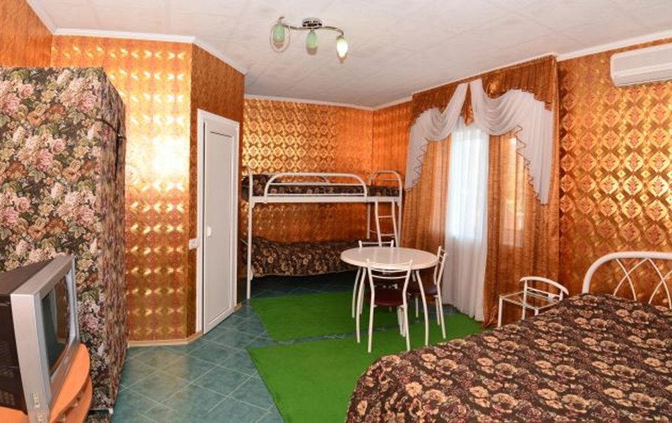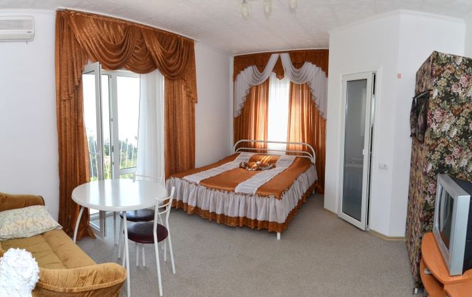Трехэтажный корпус отеля (без лифта) занимает озелененную благоустроенную территорию с небольшим фонтаном в центре. Гостей ожидают двухместные номера Стандарт с видом на море или Крымские горы. Во всех номерах есть душ, телевизор, кондиционер, на 2-м и 3-м этажах предусмотрены балконы.