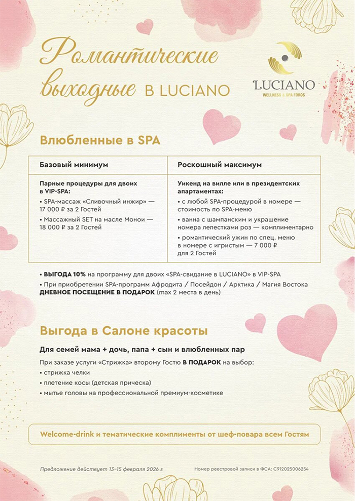 Акция "Я люблю Крым": скидка 15-25% в зависимости от забронированной категории (уже учтена при бронировании). Акция не суммируется с другими спецальными предложениями. Пересчёт старых броней не делается. Акция не действует в период 31.12.25-07.01.26.