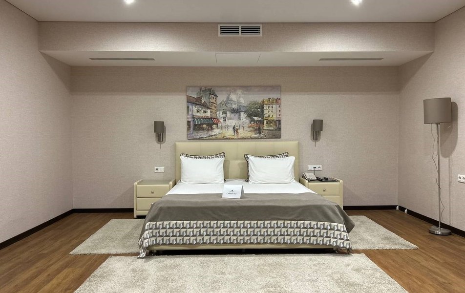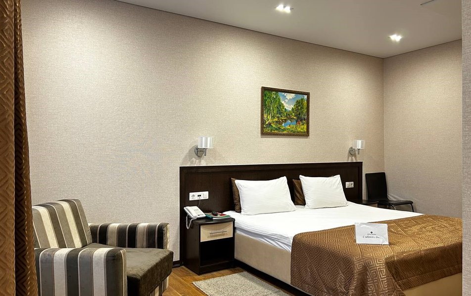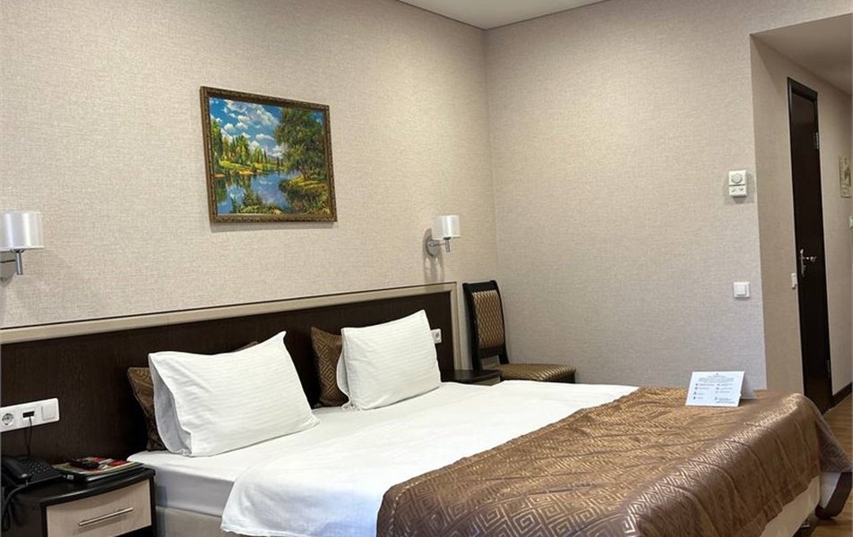 Современное 5-ти этажное здание отеля, оснащенное лифтом, предлагает отдыхающим комфортабельные номера разных категории – Улучшенный, Стандарт, Люкс и Апартаменты, способные единовременно вместить до 165 гостей. Просторные номера, оформленные в светлых тонах, оснащены удобной мебелью, необходимой бытовой техникой – телевизором, холодильником, феном, есть ванная комната с душевой кабинкой, в апартаментах оборудована собственная мини-кухня.