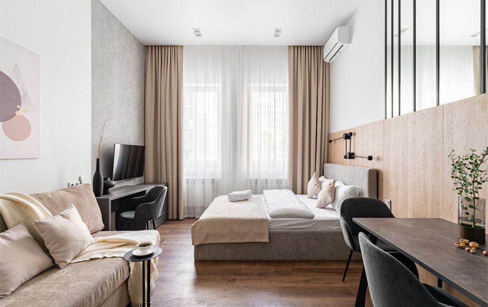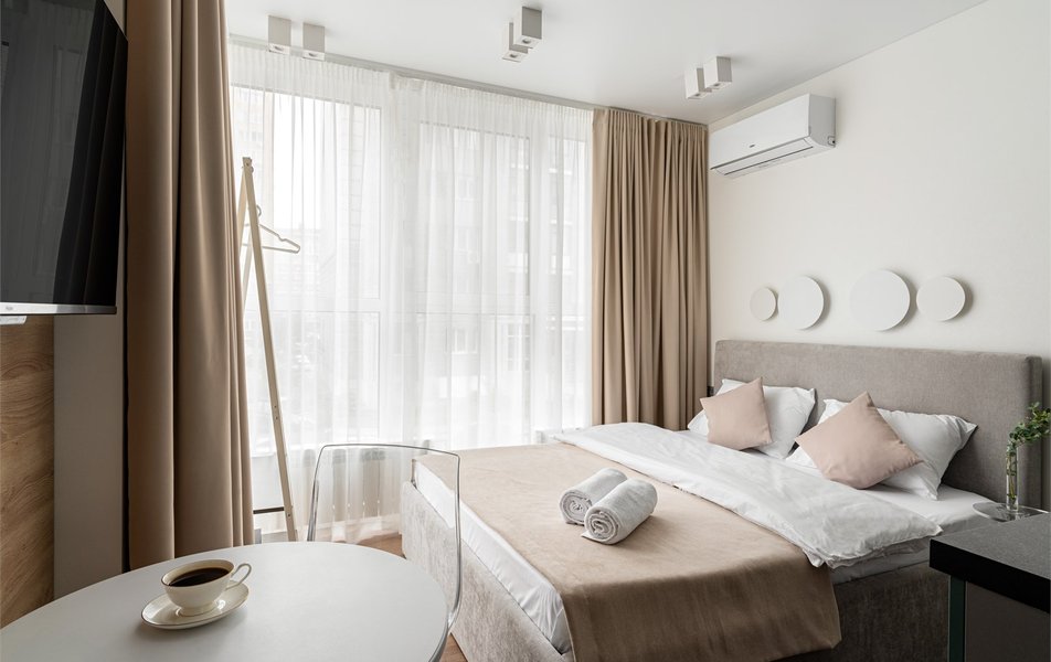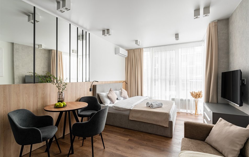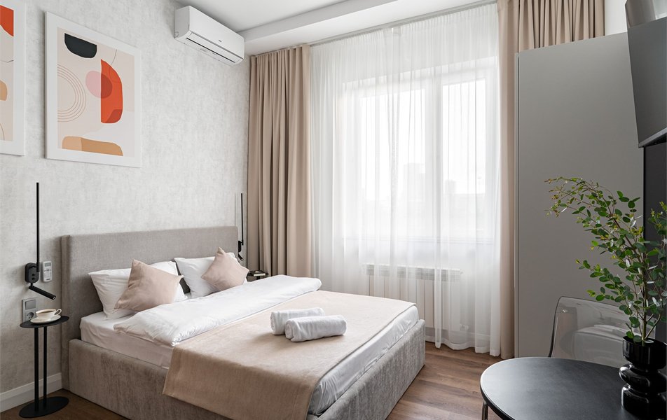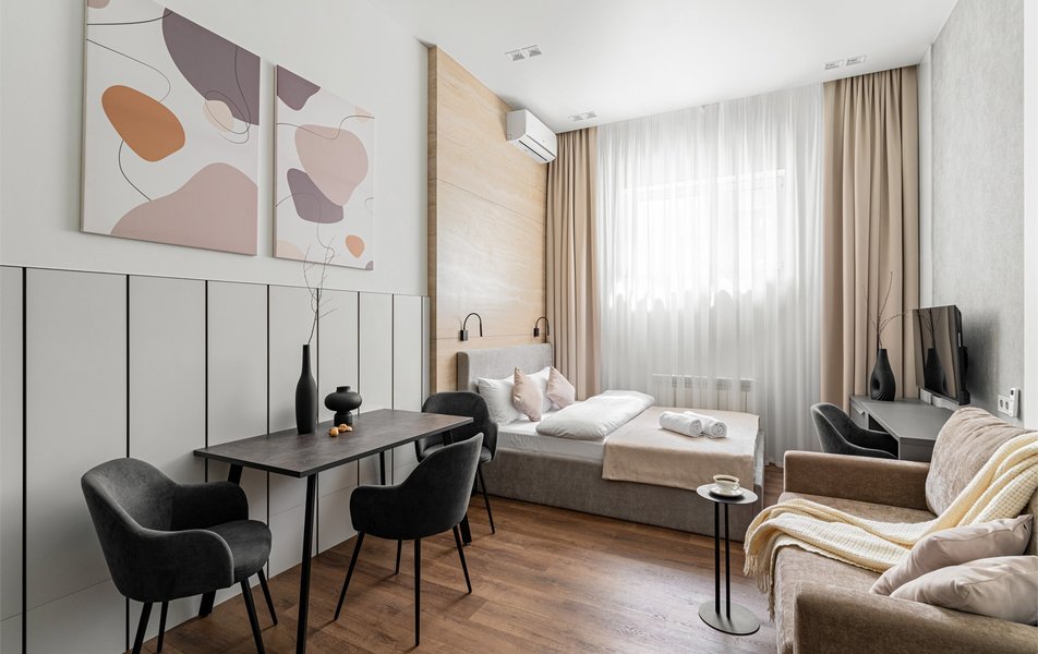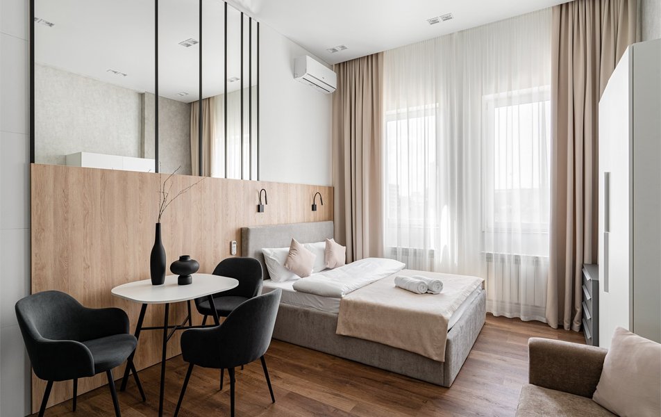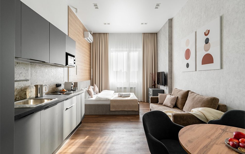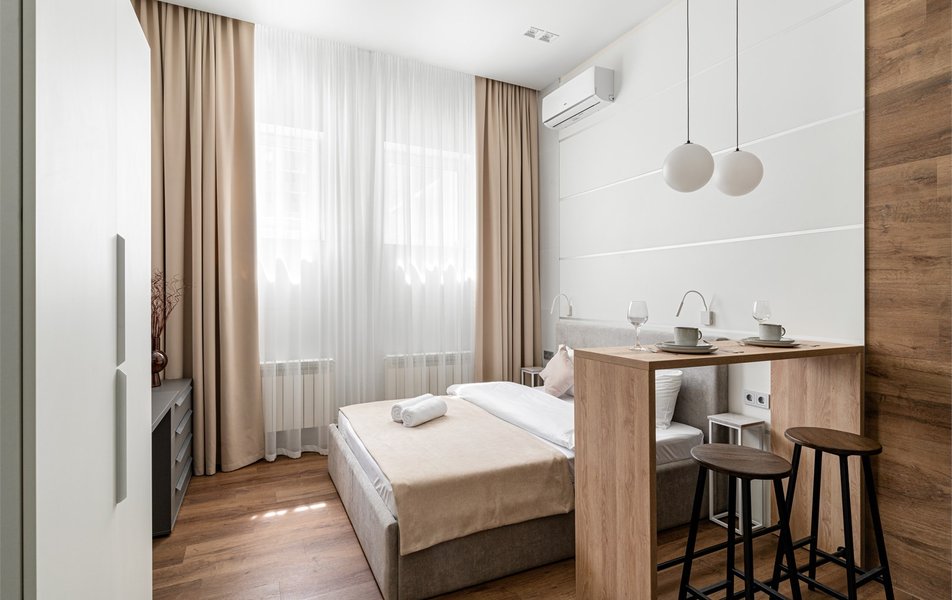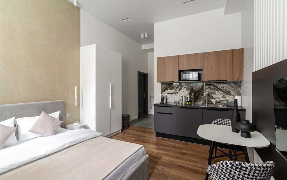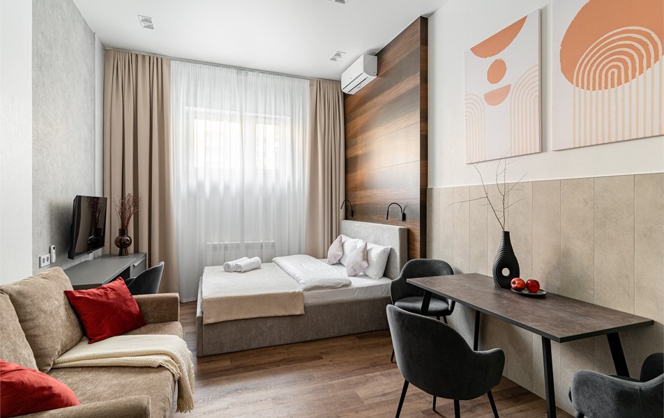 Просторные и светлые номера оборудованы всем необходимым для комфортного проживания. Современные интерьеры подчеркнуты вниманием к деталям, создающим домашний уют. Каждое помещение оснащено бытовой техникой и полным набором посуды, благодаря чему гости могут свободно готовить пищу, выбирая меню по настроению и предпочтениям. Ежедневно обновляемый порядок обеспечивает максимальный комфорт, а бесплатный беспроводной интернет поддерживает связь с внешним миром. Для семей с детьми и тех, кто предпочитает долгое проживание, предусмотрены специальные условия, включая возможности стирки вещей и хранения продуктов.